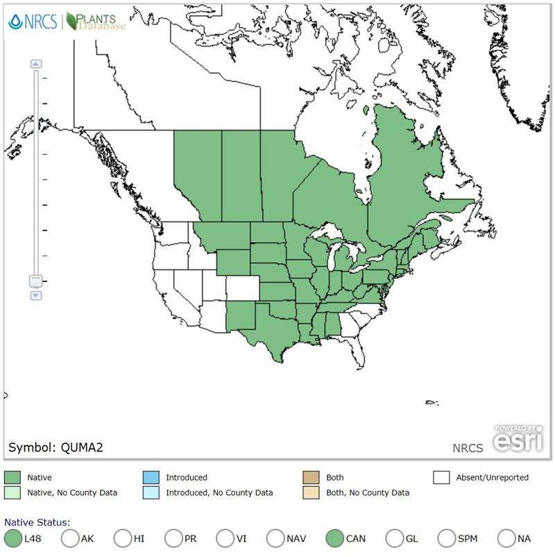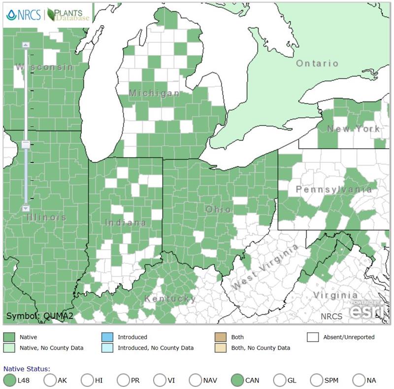 One of longest-lived and largest oaks at 80 x 80' or more. Widespread throughout eastern and plain states. Tolerant of drought, urban conditions like pollution and heat, and salt. Good choice for parkland or large yards. Acorns (produced after 35 years or so) provide food for wood ducks, wild turkeys, white-tailed deer, rabbits, mice, squirrels and other rodents, while foliage feeds important caterpillars.